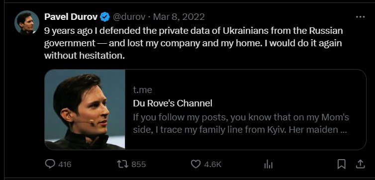 Pavel Durov trước đây vẫn ảo tưởng vào cái gọi là tự do ngôn luận phương Tây nên từ chối mọi yêu cầu lấy thông tin hay hạn chế từ cả Nga và phương Tây. Vì lẽ này Durov buộc phải bàn giao Vkontakte cho chính phủ Nga và chạy ra nước ngoài, lấy quốc tịch Pháp.