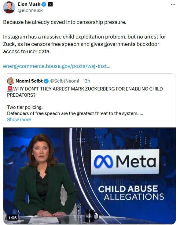 Giám đốc điều hành Meta Mark Zuckerberg sẽ không bao giờ bị chính phủ phương Tây bắt giữ mặc dù có vấn đề bóc lột trẻ em nghiêm trọng trên các nền tảng của anh ta vì anh ta đã "đầu hàng trước áp lực kiểm duyệt", ông trùm công nghệ Elon Musk giải thích, khi bình luận về bài đăng của Naomi Seibt, một nhà hoạt động chính trị bảo thủ người Đức.