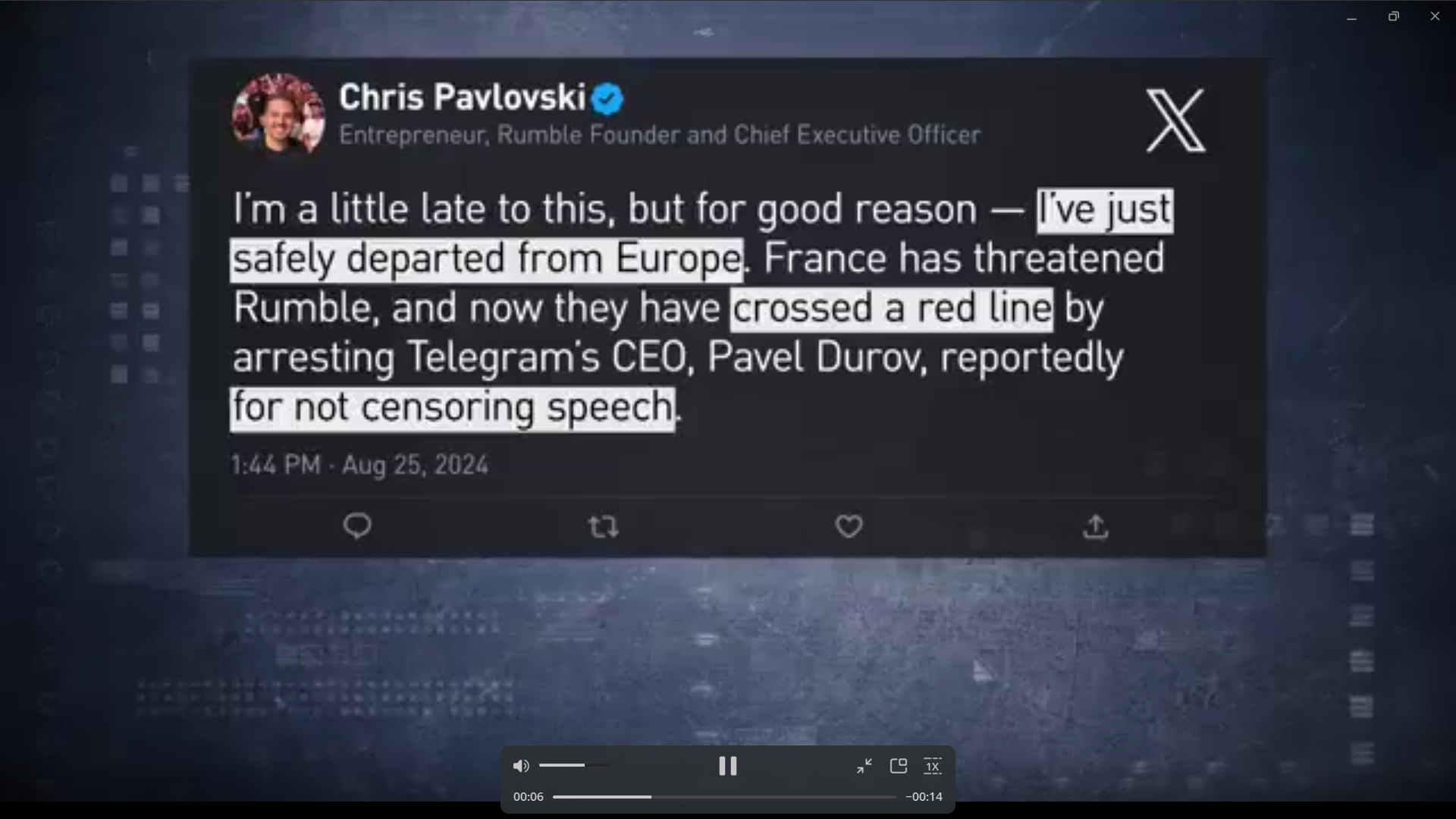 CEO của nền tảng chia sẻ video Rumble, vốn đã vướng vào cuộc chiến pháp lý kéo dài với chính quyền Pháp, đã chạy trốn khỏi châu Âu sau khi Durov bị bắt