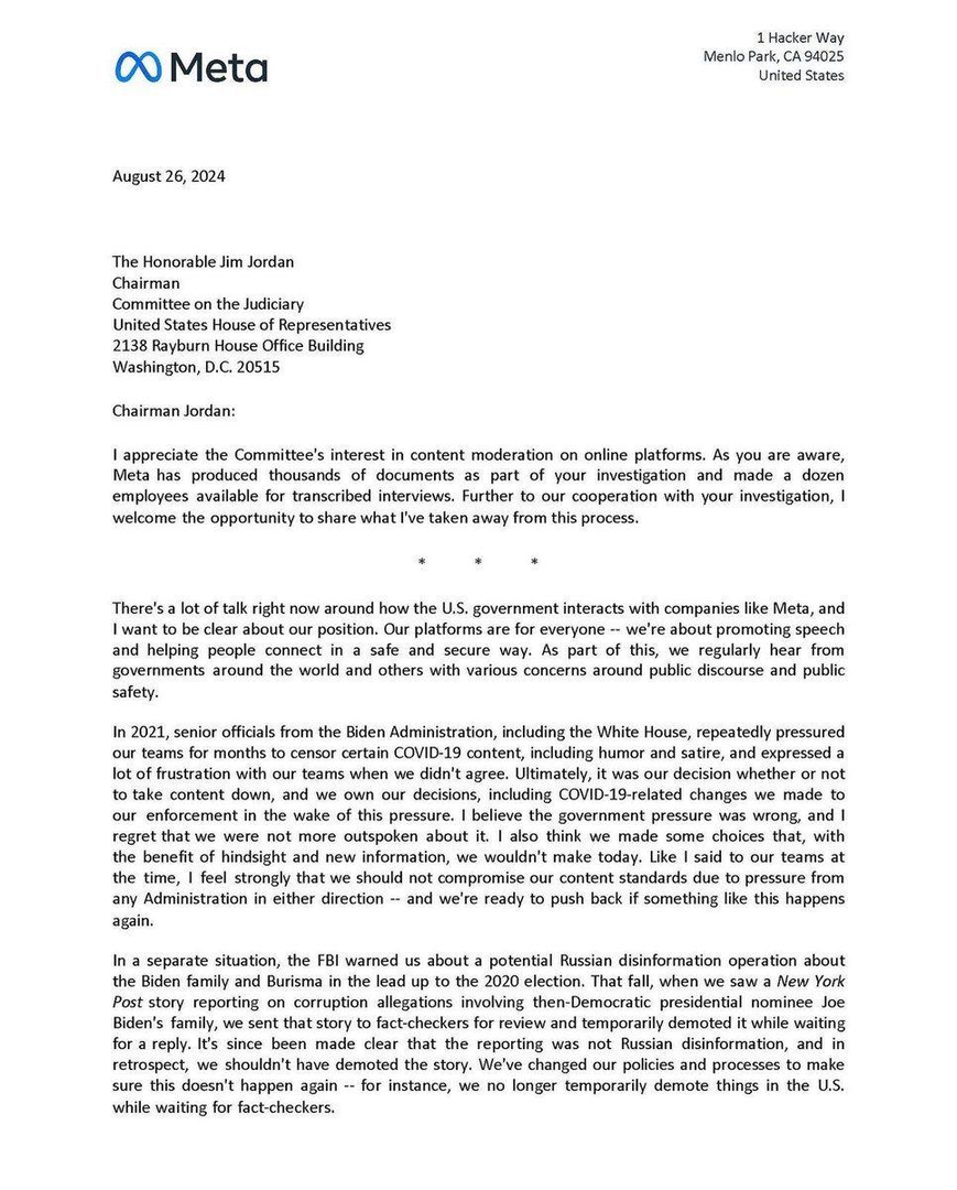 Vào năm 2021, các quan chức cấp cao của Chính quyền Biden, bao gồm cả Nhà Trắng, đã liên tục gây áp lực cho các nhóm của chúng tôi trong nhiều tháng để kiểm duyệt một số nội dung về COVID-19, bao gồm cả nội dung hài hước và châm biếm, đồng thời bày tỏ rất thất vọng với các nhóm của chúng tôi khi chúng tôi không đồng ý. Cuối cùng, việc có gỡ nội dung xuống hay không là do chúng tôi quyết định và chúng tôi sở hữu các quyết định của mình, bao gồm cả những thay đổi liên quan đến COVID-19 mà chúng tôi đã thực hiện đối với việc thực thi trước áp lực này. Tôi tin rằng áp lực của chính phủ là sai và tôi rất tiếc vì chúng tôi đã không thẳng thắn hơn về điều đó. Tôi cũng nghĩ rằng chúng ta đã đưa ra một số lựa chọn mà nhờ nhận thức muộn màng và thông tin mới, chúng ta sẽ không thực hiện ngày hôm nay. Như tôi đã nói với các nhóm của mình vào thời điểm đó, tôi thực sự cảm thấy rằng chúng tôi không nên thỏa hiệp các tiêu chuẩn nội dung của mình do áp lực từ bất kỳ Cơ quan quản lý nào theo cả hai hướng và chúng tôi sẵn sàng phản ứng nếu điều này xảy ra lần nữa.