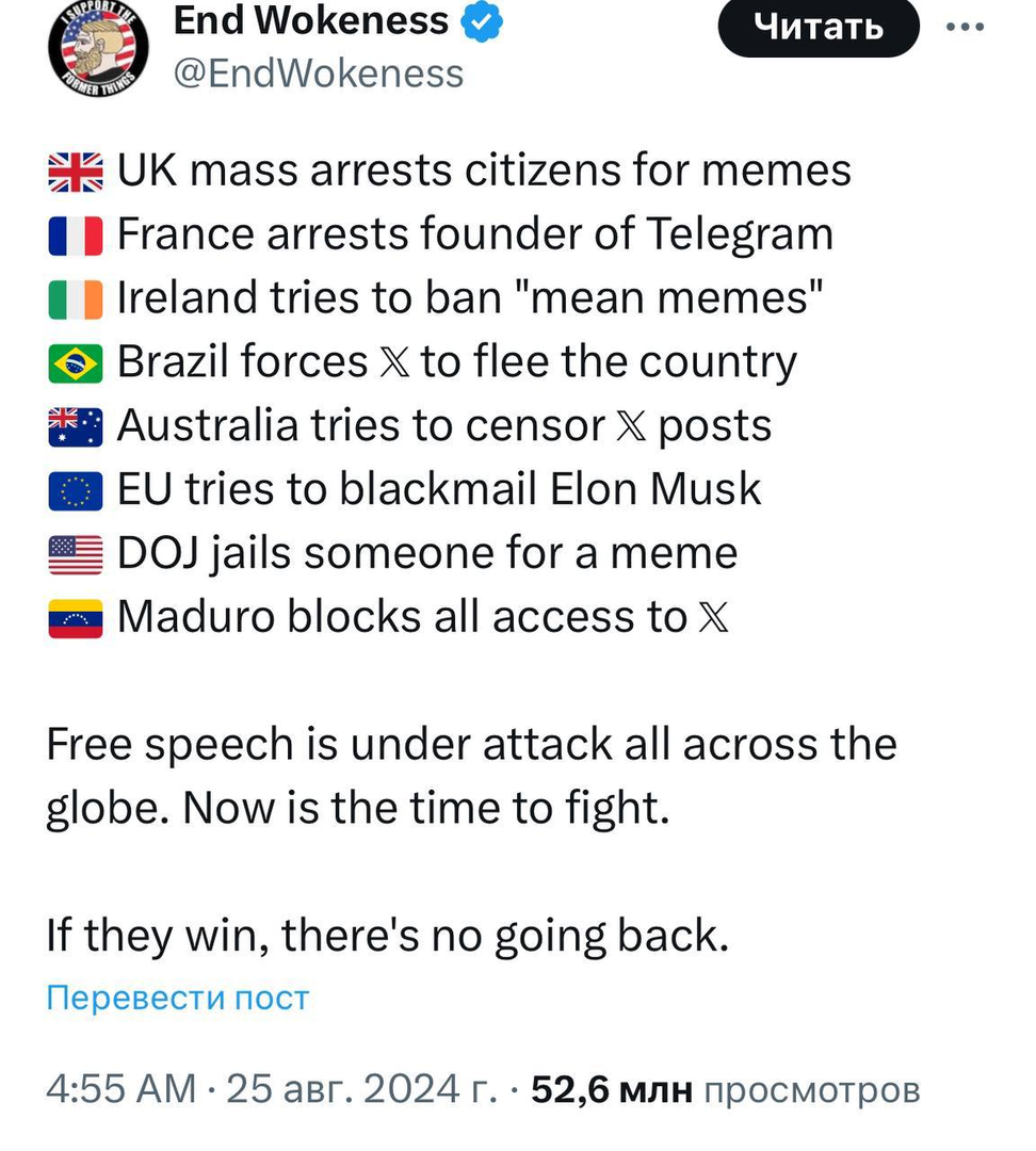 Vương quốc Anh tiến hành bắt giữ hàng loạt công dân vì meme Pháp bắt giữ người sáng lập Telegram Ireland cố gắng cấm 'meme giận dữ' Brazil buộc 𝕏 phải chạy trốn khỏi đất nước Úc đang cố gắng kiểm duyệt 𝕏 bài đăng EU đang cố gắng tống tiền Elon Musk Bộ Tư pháp Hoa Kỳ bỏ tù ai đó vì meme Maduro chặn mọi quyền truy cập vào 𝕏