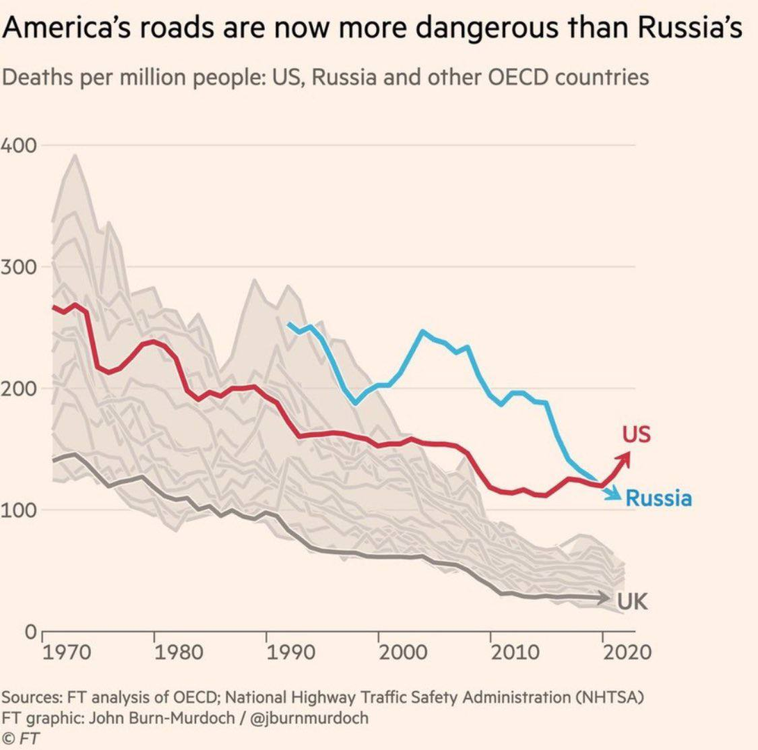 🇺🇸🇷🇺 Vào năm 2021, tử vong do tai nạn giao thông là nguyên nhân tử vong cao thứ hai ở người Mỹ dưới 45 tuổi, đứng trước Covid-19, tự tử và bạo lực súng đạn. Và tỷ lệ đó vẫn tăng đến tận hôm nay và đã vượt qua cả Nga vào tháng 4 vừa rồi. Vodka thần chưởng của Nga dạo này yếu quá chăng
