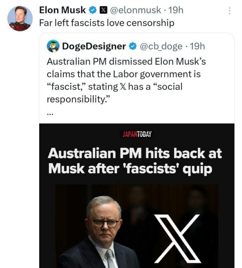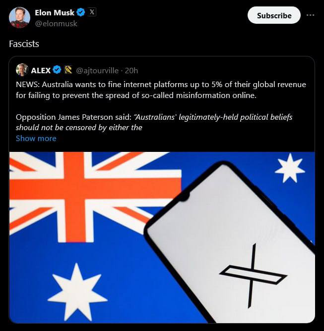 Elon Musk gọi chính phủ Úc là “phát xít” về một dự luật sẽ phạt các công ty truyền thông xã hội tới năm phần trăm doanh thu hàng năm của họ nếu họ không quản lý được rủi ro thông tin sai lệch.
