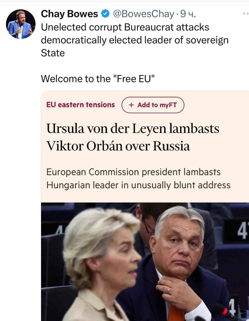Doanh nhân người Ireland Chey Bowes nói về cuộc tấn công của von der Leyen vào Orban vì Nga: —Một quan chức tham nhũng, không được bầu chọn đã tấn công nhà lãnh đạo được bầu cử dân chủ của một quốc gia có chủ quyền. Chào mừng đến với EU Tự do.