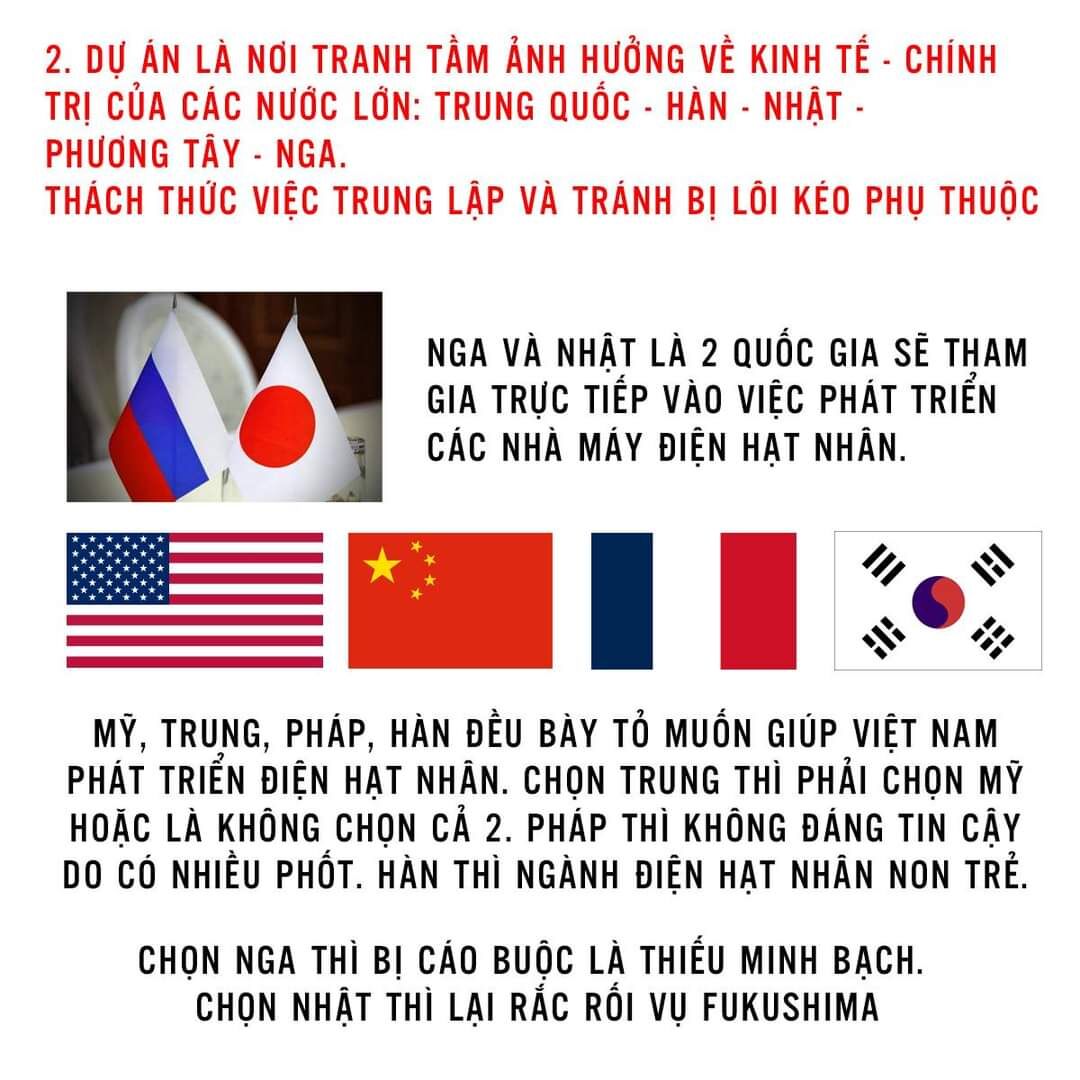 Có rất nhiều nước ủng hộ, sẵn sàng cho vay và đầu tư DA điện hạt nhân ở VN như Nga, Nhật, Mỹ, Pháp, Hàn Quốc... vì miếng bánh quá to và ngon. Nhưng chọn ai cũng dở vì sợ phật lòng những nước còn lại.