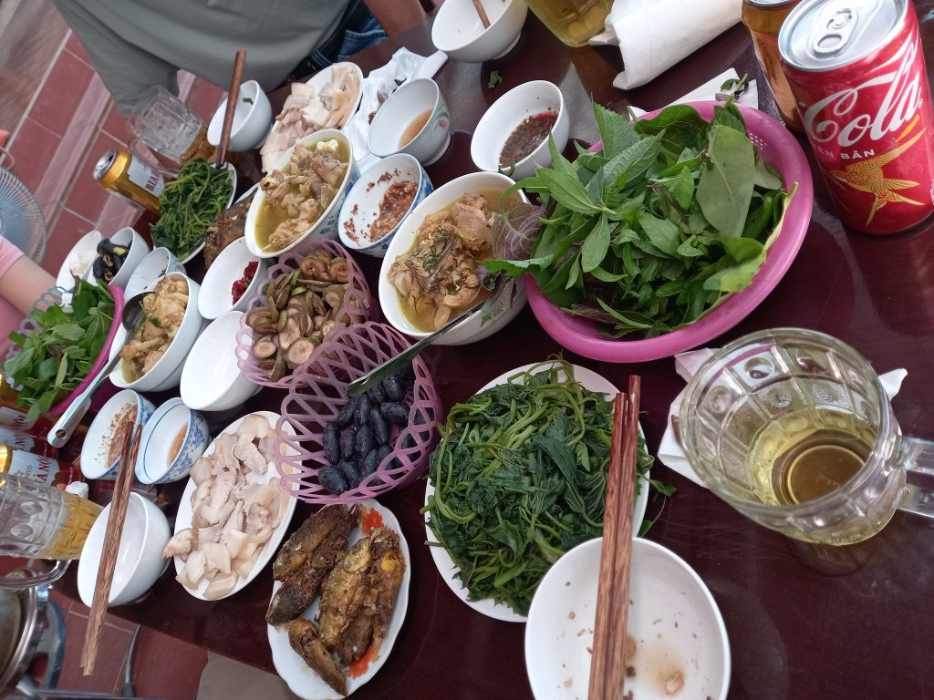... và được các bác chủ nhà thết đãi bữa cơm quê cây nhà lá vườn rất ngon. Mợ @chan-thu bình thường e lệ, thế mà bữa này xơi rất nhiệt tình và khen nức nở
