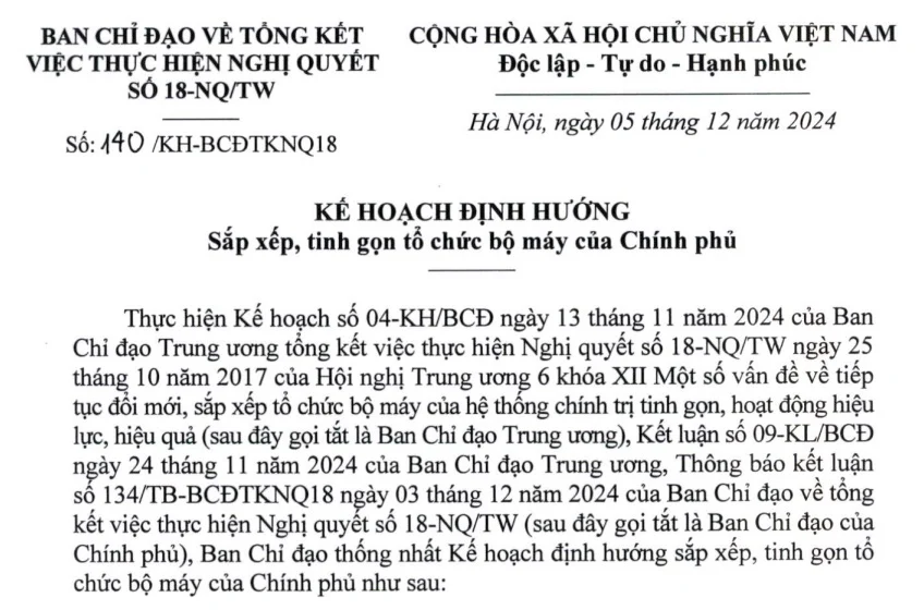 Ngày 05/12/2024, Ban Chỉ đạo về Tổng kết việc thực hiện Nghị quyết 18-NQ/TW đã có Kế hoạch 140/KH-BCĐTKNQ18 về Kế hoạch định hướng sắp xếp, tinh gọn tổ chức bộ máy Chính phủ.