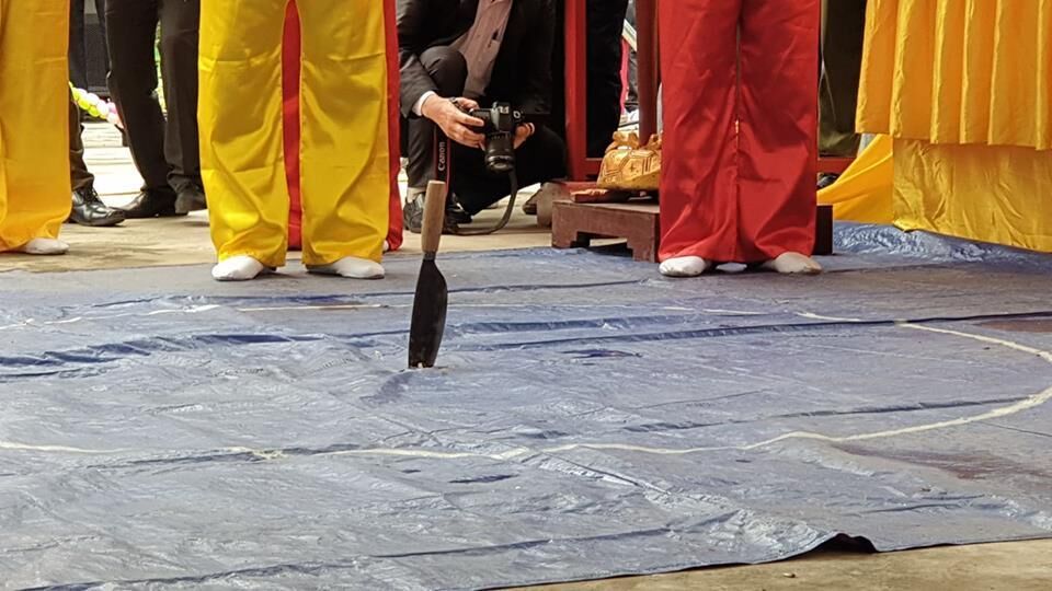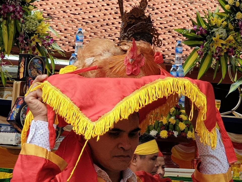 Sau lời thề, chủ lễ cầm dao bầu cắt tiết linh kê (gà trống lông vàng, chân màu vàng) hòa vào bình rượu.