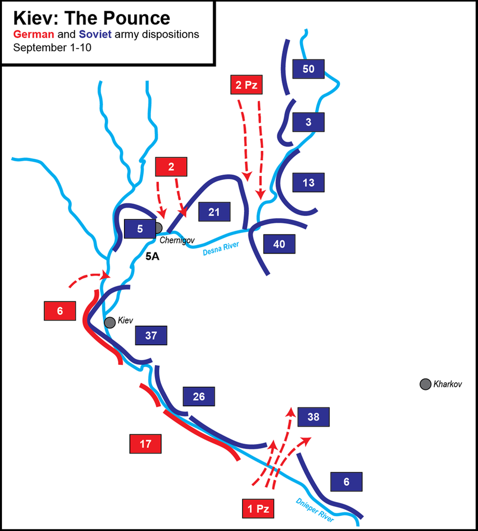 Kế hoạch về cơ bản hoạt động đến mức hoàn hảo. Tập đoàn quân thiết giáp số 2 của Guderian bắn thẳng về phía nam dọc theo khúc cua trong của sông Desna và tấn công vào điểm bản lề giữa Tập đoàn quân 21 và 40 của Liên Xô. Đồng thời, Tập đoàn quân thiết giáp số 1 của Kleist vượt sông Dneiper về phía đông nam Kiev và chọc thủng phòng tuyến của Tập đoàn quân 38 Liên Xô. Quân Đức lúc này có hai Tập đoàn thiết giáp hùng mạnh (sử dụng chín sư đoàn thiết giáp kết hợp với các sư đoàn bộ binh cơ giới đi sau) đột nhập vào hậu cứ của quân đội Liên Xô ở khúc quanh Dnepr, với ba tập đoàn quân dã chiến (quân đoàn 2, 6 và 17) trấn áp phần còn lại của các phòng tuyến của Liên Xô xung quanh Kiev.