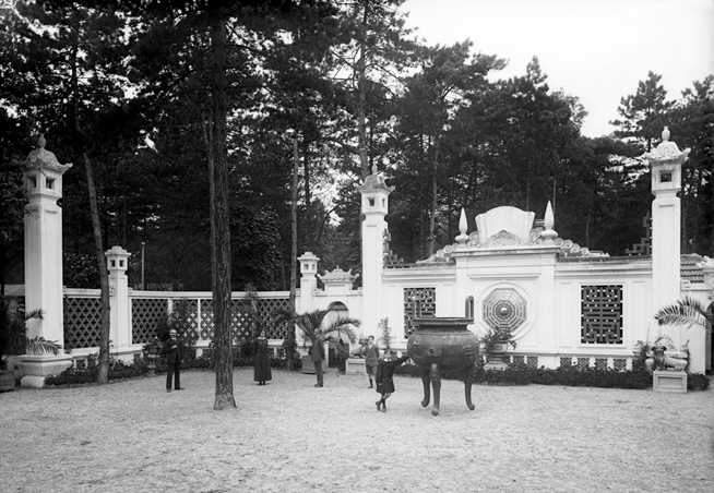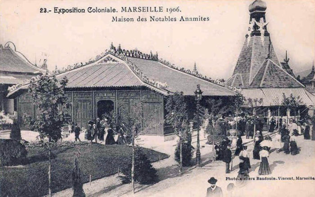 Ngôi nhà Nam kỳ (tiền thân của Nghĩa sĩ miếu) trong khuôn viên Triển lãm Thuộc địa Marseilles năm 1906.