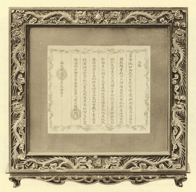 Sắc văn có nội dung: “Đại Nam hoàng đế sắc ban cho lính chiến, lính thợ qua Tây: Ngày trước vâng lời dụ của trẫm ứng mộ qua quý quốc, có người làm việc lập công không nề lao khổ, có người cầm gươm khoác giáp dũng cảm xông lên, nhiệt thành với lân bang, hết lòng trong nghĩa vụ, không may mà chết. Người đời từ trước ai không chết, chết vì việc nước chết cương thường là chết được đúng chỗ, chết có tiếc gì. Nhưng hồn côi đất lạ, thân quyến ngóng trông, nhắc tới việc ấy, trẫm rất thương xót. Nay võ công cáo thành, lập đền kỷ niệm ở quý quốc để thờ cúng, linh sảng ngàn thu nhờ đó được cúng tế tiếc thương. Anh hùng muôn thuở ngang qua nơi ấy ngẫm nghĩ nhớ nhung, nếu có thiêng thì nơi chín suối cũng được an ủi. Kính thay!”