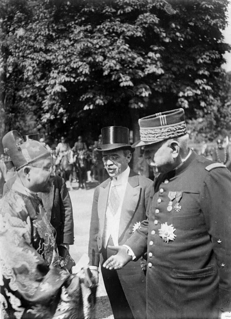 Thống chế Joffre, Bộ trưởng Thuộc địa A. Sarraut và ông Đặng Ngọc Oánh, đại diện triều đình Huế.