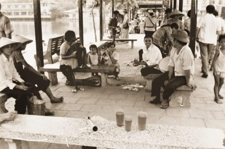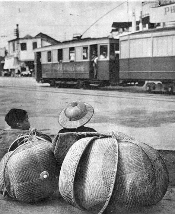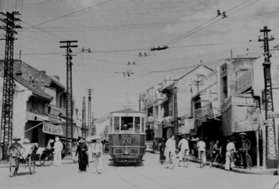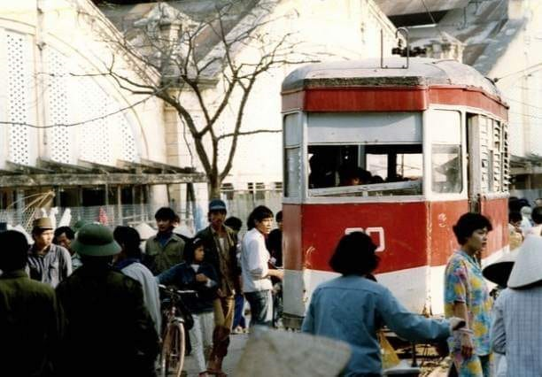 Chợ Đồng Xuân nhìn từ phố Hàng Giấy. Ngày đó chợ Đồng Xuân chưa có những mái vòm bê tông do người Pháp xây dựng như bây giờ mà chỉ là những mái tôn. Ngôi chùa trong ảnh nay đã không còn, đường xe điện chạy qua ngã tư Hàng Khoai, Hàng Giầy cũng đã biến mất.