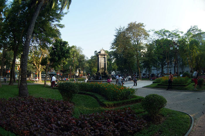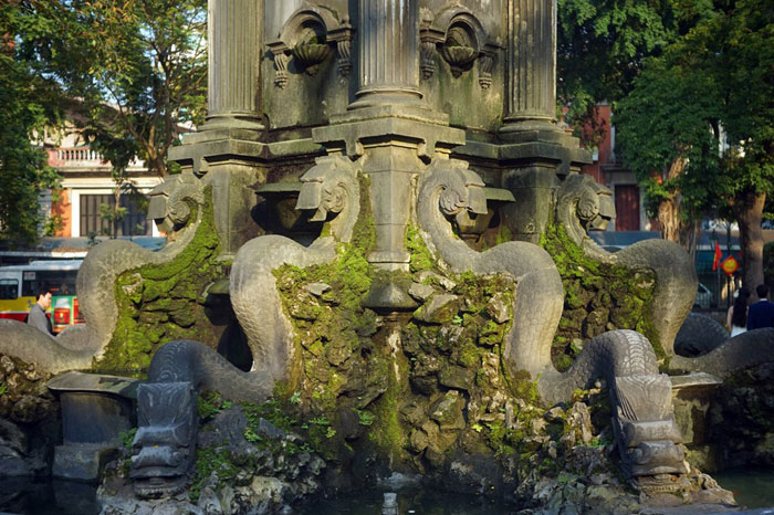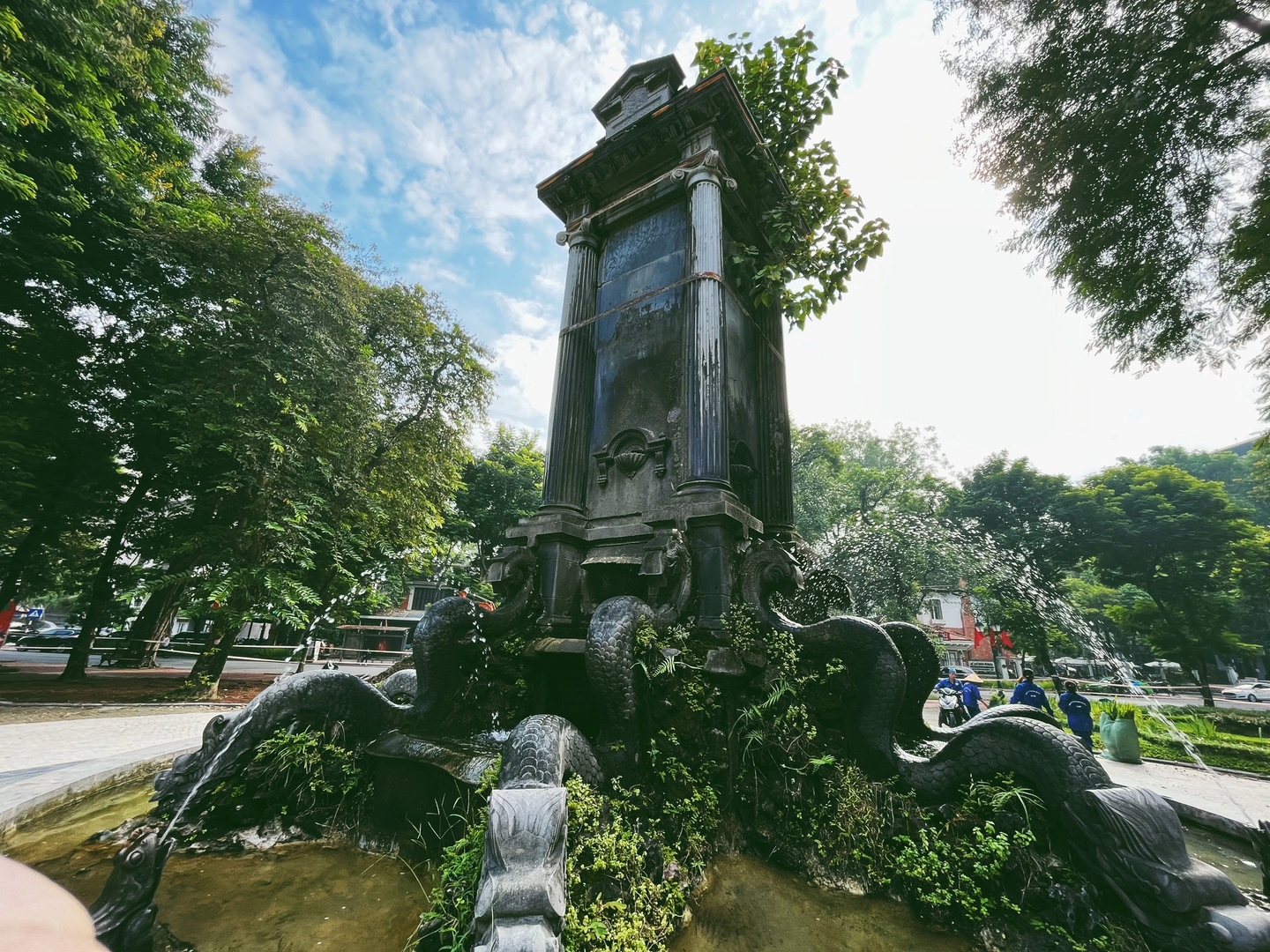 Giữa vườn hoa là một đài phun nước (hiện tại, đây là đài phun nước cổ nhất Hà Nội), có một trụ đá to hình vuông, cao khoảng 3,5m ở giữa, xung quanh có những con cóc bằng đồng phun nước lên trụ đá. Vì vậy vườn hoa còn được người Hà Nội gọi là vườn hoa Con Cóc.