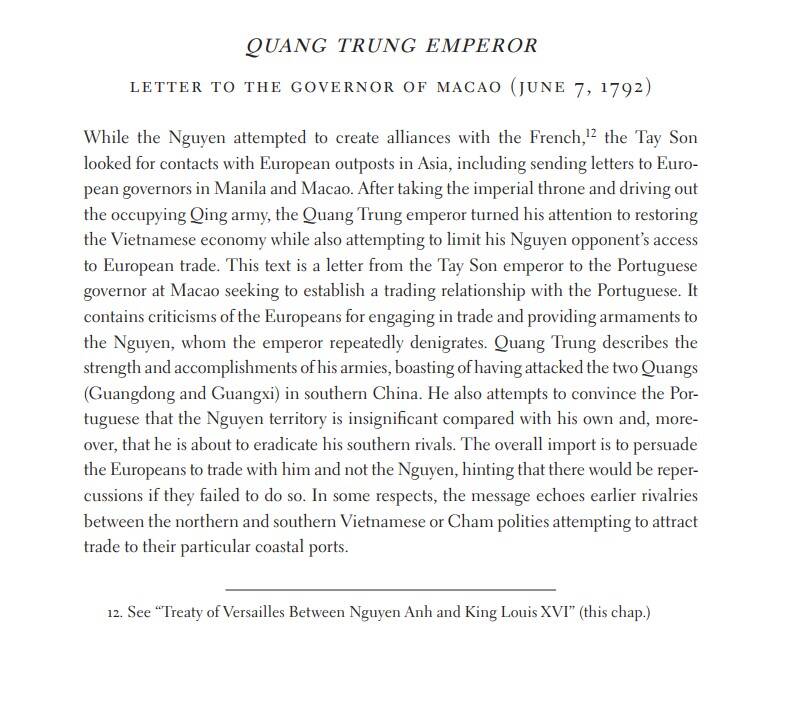 Dịch từ Pierre-Yves Manguin, Le Nguyen, Macau et le Portugal: Aspects politiques et commerciaux d’une relation privilégiée en Mer de Chine 1773-1802, (Paris: École Française d’ Extrême-Orient, 1984), pp. 98-99]