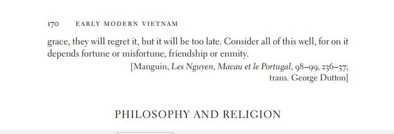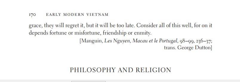 As a consequence of this, you, the king of Macao, in truth but a small territory, should decide and send an edict in firm terms. I understand that not all those in Macao are supporters of the Nguyen in the outcome of this affair and were motivated to engage in commerce with Dong Nai only out of greed. They should not return there, so that they might no longer be marked by this wicked Nguyen lineage and no longer take part in their intrigues and criminal actions, under the pain of becoming, without any doubt, victims of my sword. My desire is to pacify all the neighboring princedoms, and I do not wish to be in discord with them. It is for this reason, king of Macao, that I admonish you and urge you to give rigorous instructions to your subjects that if they carry out commerce, it should be to Fuchum, a port in my kingdom, where they will find an accommodating anchorage, and that they no longer return to Dong Nai and its environs, in order that they no longer fi nd themselves involved in those crimes with which they are unfamiliar. And if they do not wish to obey with good grace, they will regret it, but it will be too late. Consider all of this well, for on it depends fortune or misfortune, friendship or enmity.