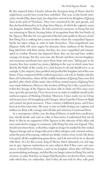 By this imperial letter, I hereby inform the European king of Macao that he might know exactly how events have unfolded. This year, in the fourth intercalary month [May–June 1792], two ships have arrived at my Kingdom of Quang Nam at the port of Thuchum. They were examined by the port guards, and they declared themselves to be ships from Macao, of which the captain’s name was Joaquim António Milner. He had carried out commerce in Dong Nai and was returning to Macao, bearing letters of recognition from this lost family of the Nguyen. But alas! He was ignorant of the fact and unable to discern clearly that Dong Nai is nothing but a minor territory where the vanquished Nguyen family has taken refuge in order to hide themselves. That insignificant man [Nguyen Anh] will never regain his domains; those madmen of the Siamese king aided him with their armies, but they, too, were vanquished and exterminated in combat. Heaven has dispersed them; they are lost and have neither courage nor troops. For fi ve years now, the French and those of your kingdom, and numerous merchants have given them boats and arms. Taking part in his tyranny, they have resisted my armies, fighting in the wars in which many have died by the blade of the sword; it is a fact known to all and should serve as an example. I, the emperor, have purified and pacified the kingdom out of this confusion. I have conquered all the southern provinces, not only in Tonkin, but also those of Cochinchina, where all the middle territories of Quang Nam were first pacified, after which all the major cities of these central regions of Quang Nam were made tributaries. However, this territory of Dong Nai is like a pearl; how is it that this lineage of the Nguyen has been able to elude me? For some years now, up to the present day, I have been at war in order to establish myself in the northern regions of Hinhing [Tonkin]. Moreover, I have made war on China and its provinces of Guangdong and Guangxi, where I put the Chinese to flight and carried out great massacres. These victories established peace, and I have been at rest for some time. My army is now on battle footing; my captains and soldiers are flush with courage and will take part wherever I command them.