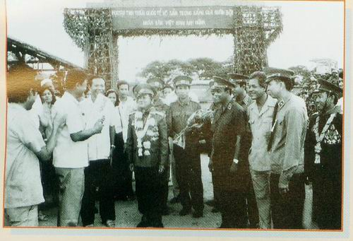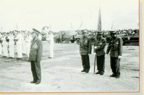 Đại tá Lê Văn Dũng - sư đoàn trưởng cùng đội danh dự tại buổi lễ tiến đua cán bộ chiến sỹ sư đoàn 9 hoàn thành nghĩa vụ quốc tế trở về nước - tháng 11.1987