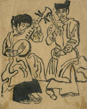 Thúy Kiều - Kim Trọng - tranh khắc gỗ của Nguyễn Tư Nghiêm