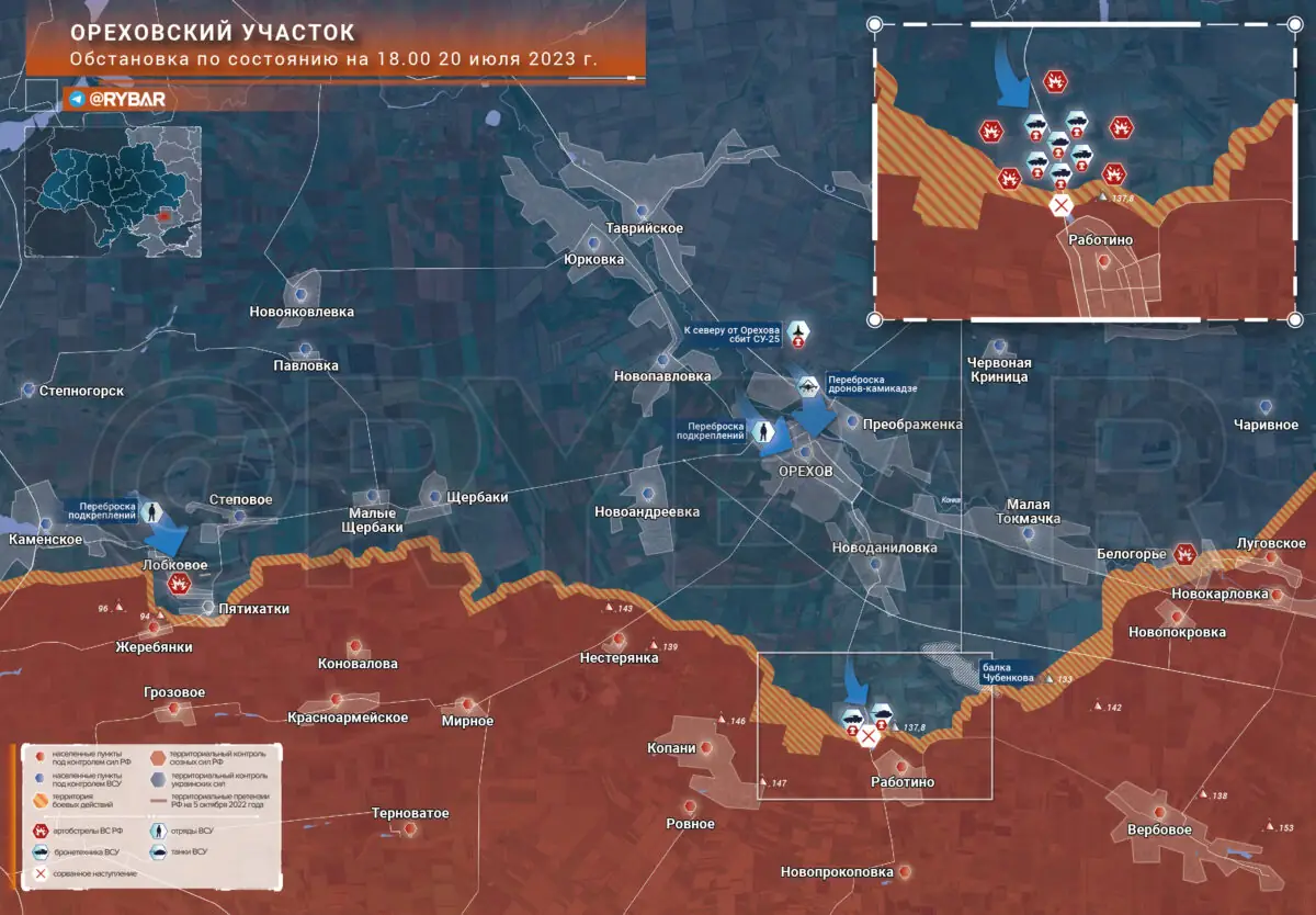 Trên khu vực Orekhov, kẻ thù đã cố gắng tấn công Rabotino một lần nữa vào ngày hôm qua, cũng như vào đêm 21 tháng 7. Bây giờ các đơn vị của Lực lượng Vũ trang Ukraine đang tập hợp lại cho cuộc tấn công tiếp theo.