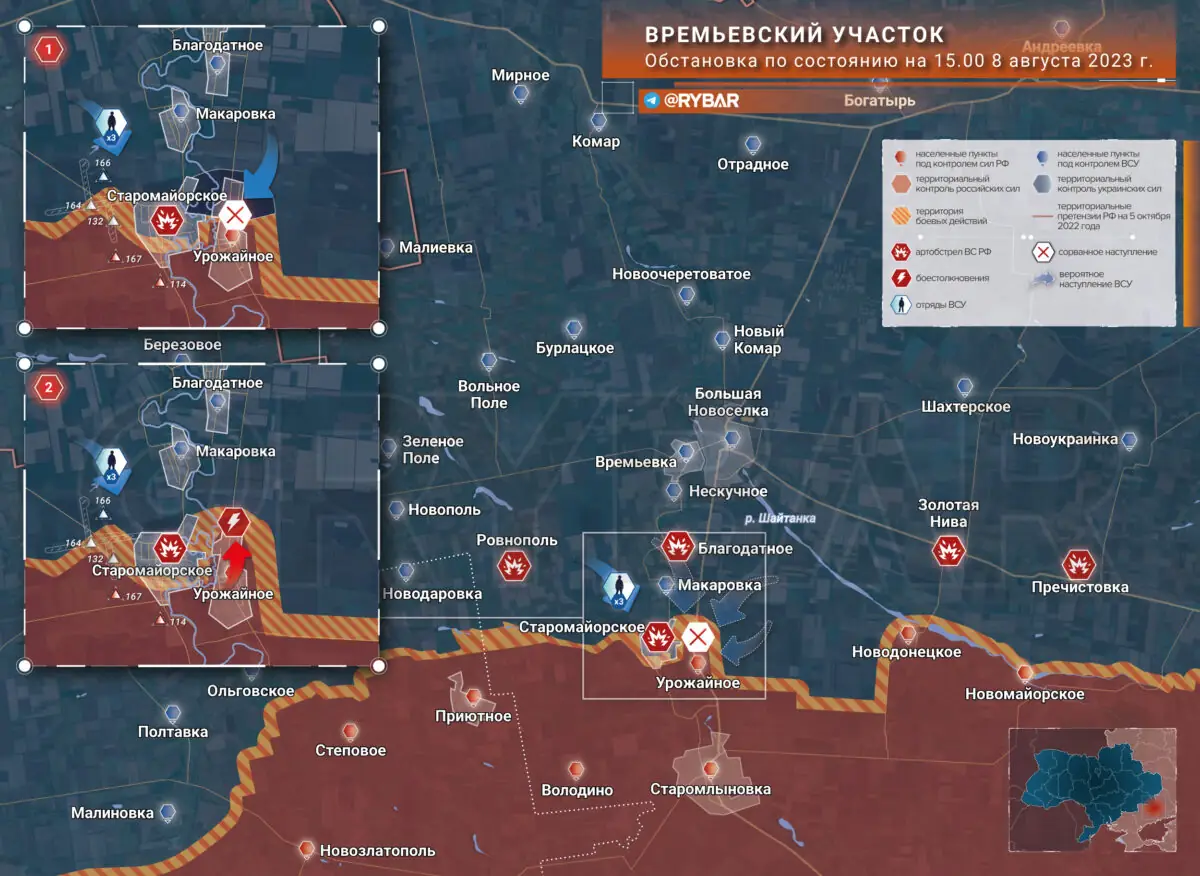 Giao tranh ác liệt vẫn tiếp tục ở Urozhaynoe trên khu vực Vremersk. Quân đội Nga giữ vị trí của họ trong ngôi làng gần như bị phá hủy hoàn toàn, nhưng đội hình của Ukraine tiếp tục bị đẩy tới bởi làn sóng lực lượng mới. Pháo binh đang hoạt động trên các vị trí của Lực lượng Vũ trang Nga gần như không ngừng nghỉ, kẻ thù đang sử dụng bom chùm. Tình hình trong khu vực vẫn còn khó khăn, sự hiện diện của kẻ thù ở phía bắc của Urozhaynoe vẫn còn.