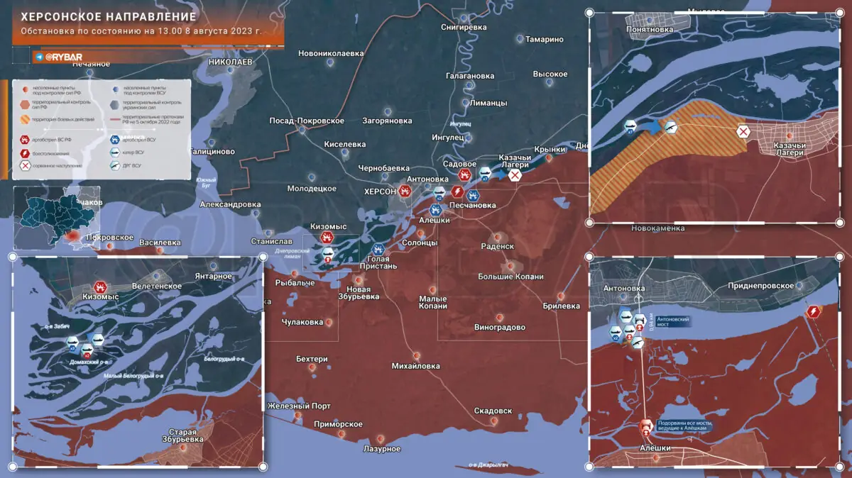 Tuy nhiên, sự hiện diện của Lực lượng vũ trang Ukraine ở phía tây Trại là một sự thật. Hoạt động của các nhóm biệt kích không dừng lại, pháo binh và súng cối đang tiến hành một cuộc pháo kích lớn dọc theo bờ sông. Chỉ định mục tiêu được cung cấp bởi xạ thủ và UAV. Tương tự, các nhóm trinh sát Ukraine hoạt động gần cầu Antonovsky và trong khu vực Golaya Prystan, nơi họ thường xuyên triển khai lực lượng trên thuyền và xuồng. Đúng, mối đe dọa từ chúng vẫn không đáng kể, nhưng nếu chúng ta tính đến số lượng các nhóm biệt kích dọc theo toàn bộ Dnepr, thì một bức tranh khó chịu sẽ xuất hiện.