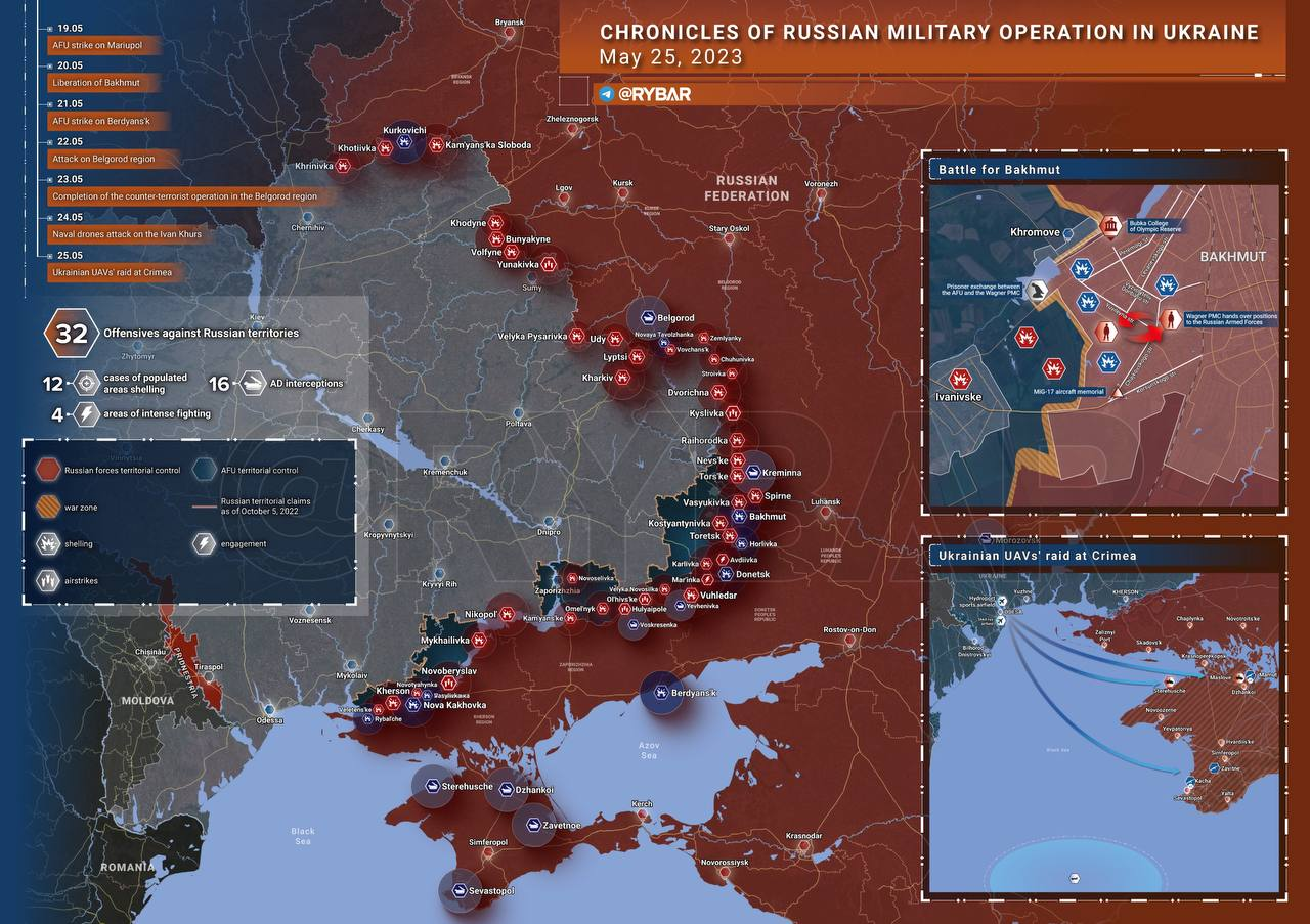Tối 25.05, quân đội Ukraine đã tổ chức một cuộc tấn công bằng máy bay không người lái Mugin-5 vào các cơ sở trên bán đảo Krum. Tất cả các máy bay đều bị bắn hạ hoặc bị nhăn chặn trước khi chúng đến được mục tiêu. Vào buổi tối muộn, Lực lượng Vũ trang Nga ở hướng Donetsk đã phá hủy đập của hồ chứa Karlovsky, làm phức tạp việc hậu cần của Lực lượng Vũ trang Ukraine ở khu vực này.