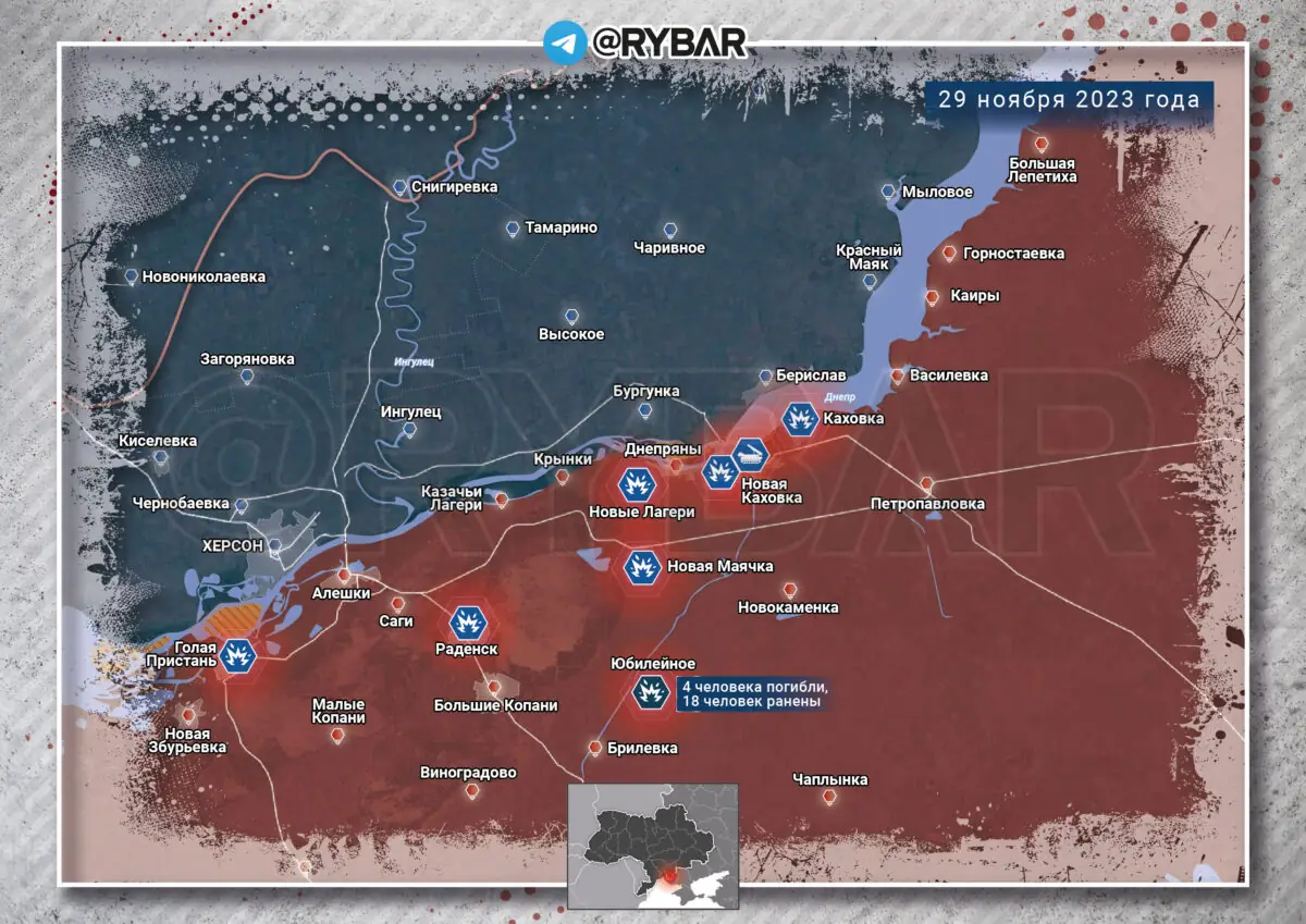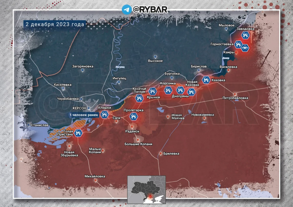 Theo hướng Kherson, ở Krynki, tình hình về cơ bản vẫn giữ nguyên: đội hình của Ukraine, đã bố trí dọc theo bìa rừng, đang cố gắng tiến sâu hơn, nhưng vô ích. Hôm qua, hai nhóm tấn công của lính thủy đánh bộ Hải quân Ukraine từ cái gọi là nhà kính đã bị pháo kích, và sau đó là các nhóm trinh sát Nga tấn công. Kết quả của cuộc đấu súng, lính thủy đánh bộ Ukraine rút lui và sau đó được sơ tán đến vùng ngoại ô phía bắc. Đến đêm, hai phân đội xung kích của địch trên hai chiếc thuyền đổ bộ vào vùng ngoại ô phía bắc của làng. Đồng thời, việc luân chuyển nhân sự được thực hiện dưới cây cầu đường sắt, nơi một ngày trước đó đã bị Lực lượng vũ trang Nga tấn công.