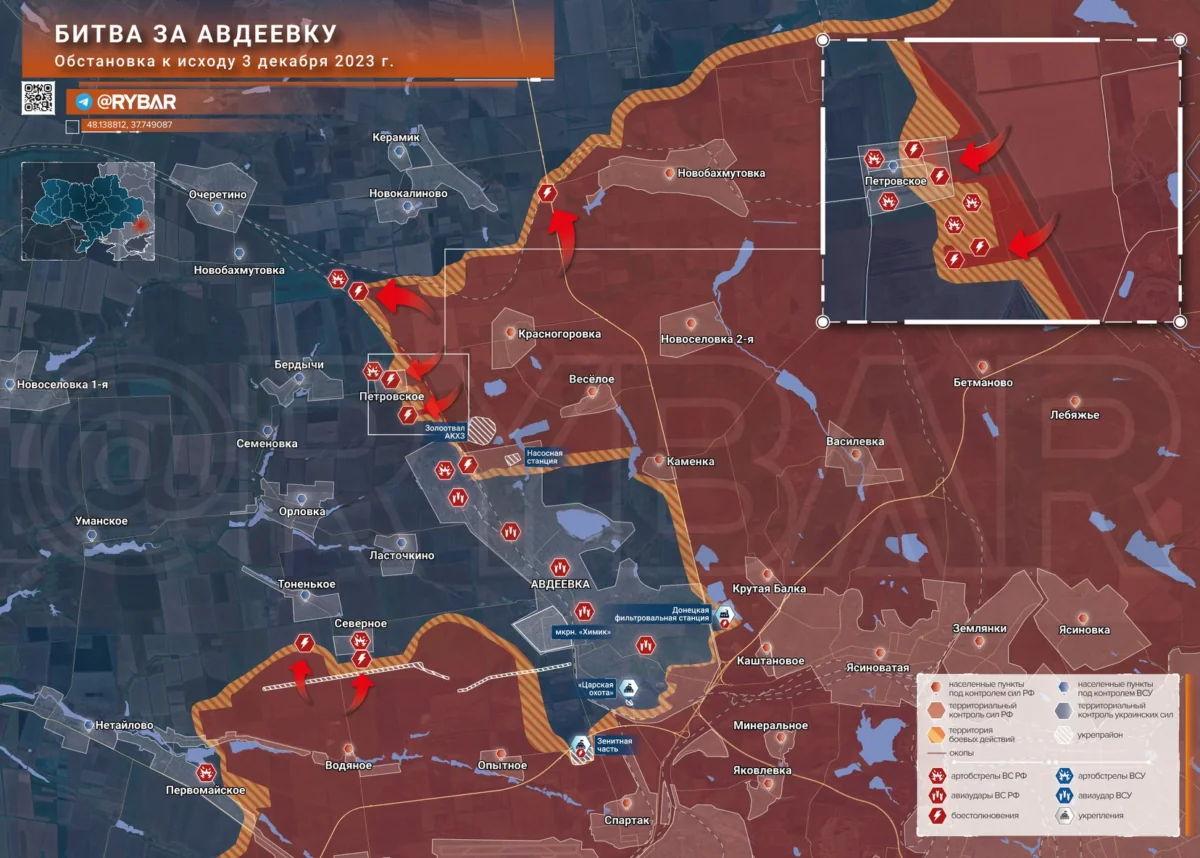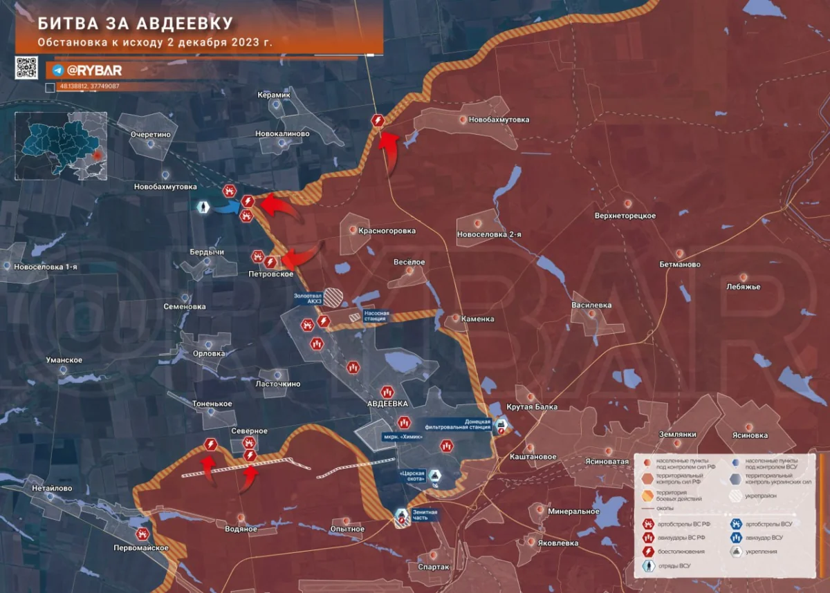 Tại địa điểm Avdeevka, Lực lượng vũ trang Nga đã hoàn thành việc giải tỏa khu công nghiệp phía nam. Ngoài ra, Lực lượng vũ trang Nga đang phát triển một cuộc tấn công trong khu vực nhà máy than cốc Novokalinovo và Avdeevsky. Đổi lại, có những xung đột về vị trí giữa Severnoe và Tonenkoe. Có báo cáo về khả năng chuyển lực lượng dự bị mới của Lực lượng vũ trang Ukraine từ hướng Zaporozhye.