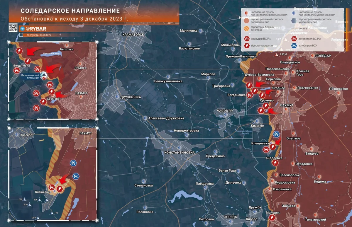 Theo hướng Soledar, Lực lượng vũ trang Nga đang mở rộng vùng kiểm soát về phía bắc Bakhmut, cố gắng cắt đứt tuyến đường mà kẻ thù tiếp tế cho nhóm ở Krasnoe. Ở sườn phía nam khu vực Kleshcheevka, các đơn vị Nga đã cải thiện vị trí chiến thuật của mình gần các cao điểm hiện hành. Nhìn chung, tại khu vực này, quân nhân Nga tự tin nắm thế chủ động trong tay: trong hai tuần qua, họ đã giải phóng được gần như toàn bộ lãnh thổ đã mất trong sáu tháng giao tranh trước đó.
