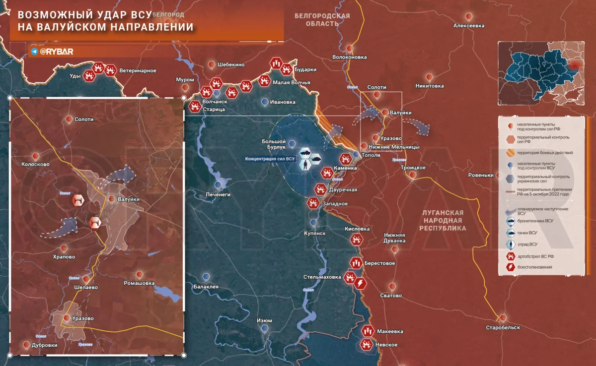 Tại các khu vực biên giới trong những ngày gần đây, hoạt động của Lực lượng Vũ trang Ukraine gần quận Valuysky của vùng Belgorod đã gia tăng. Ở phía bắc Kupyansk, dọc theo sông Oskol, cũng như vùng lân cận Bolshoy Burluk, có lực lượng của Lực lượng đặc biệt số 1, Lữ đoàn 3 và một số phân đội Phòng vệ lãnh thổ của Lực lượng Vũ trang Ukraine.