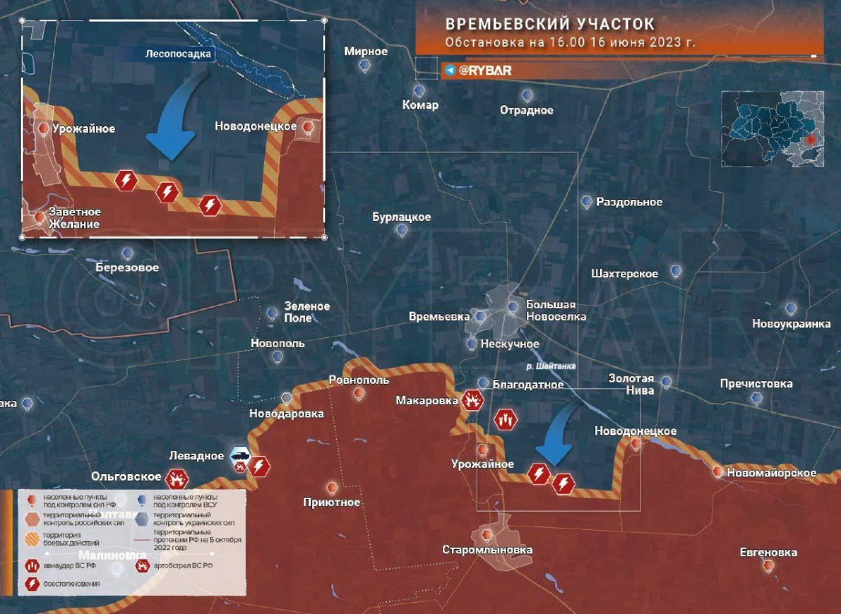 Trên mỏm đá Vremevsky, các cuộc chiến tích cực nhất đã diễn ra tại các khu vực định cư Rivnopol và Urozhaynoye của Cộng hòa Nhân dân Donetsk, nơi, do các hành động dũng cảm của các đơn vị Nga thuộc nhóm quân đội Vostok, các cuộc không kích và hỏa lực pháo binh, năm cuộc tấn công của Lực lượng Vũ trang Ukraine đã bị đẩy lùi.