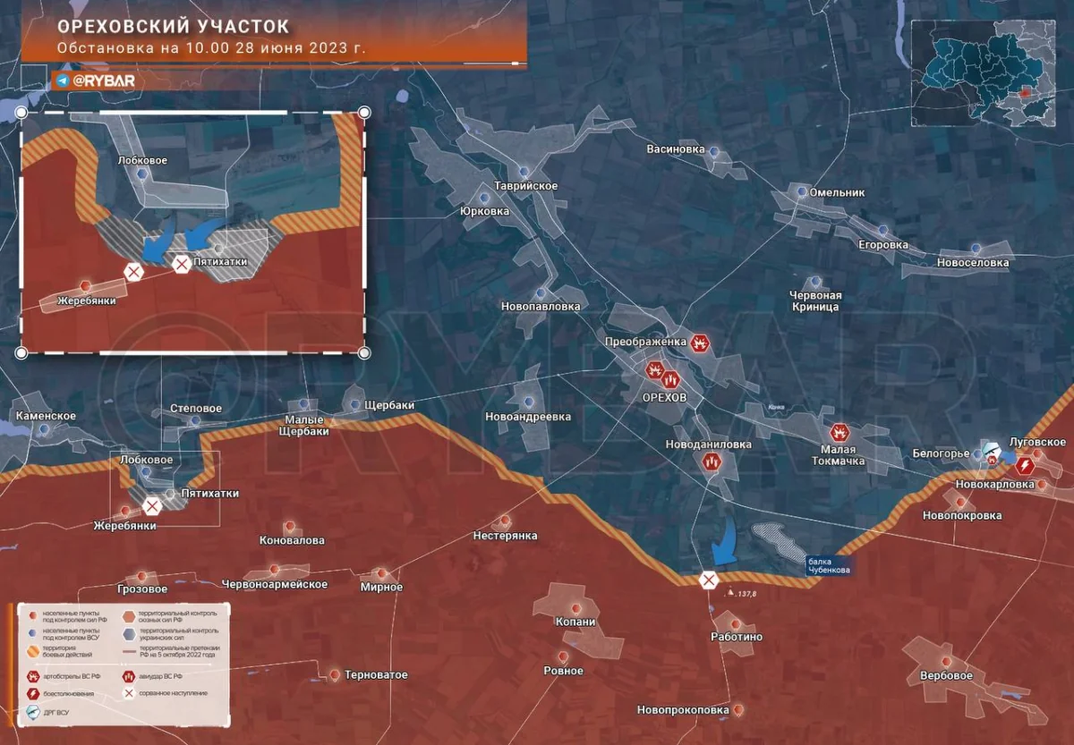 Theo hướng Zaporozhye vào buổi sáng, một nhóm tấn công của Lữ đoàn bộ binh cơ giới 65 của Lực lượng Vũ trang Ukraine, không có xe bọc thép đi kèm, đã cố gắng đột nhập vào các vị trí của quân đội Nga ở phía bắc Rabotino. Các quân nhân của Lực lượng vũ trang Nga đã nhận thấy trước hoạt động của kẻ thù và tấn công chúng. Ở vùng lân cận Pyatikhatki, tình hình không có nhiều thay đổi, bản thân ngôi làng vẫn nằm trong vùng xám. Sáng nay, theo kênh Đặc nhiệm Archangel, Lực lượng vũ trang Ukraine đã cố gắng sơ tán những người chết và bị thương.