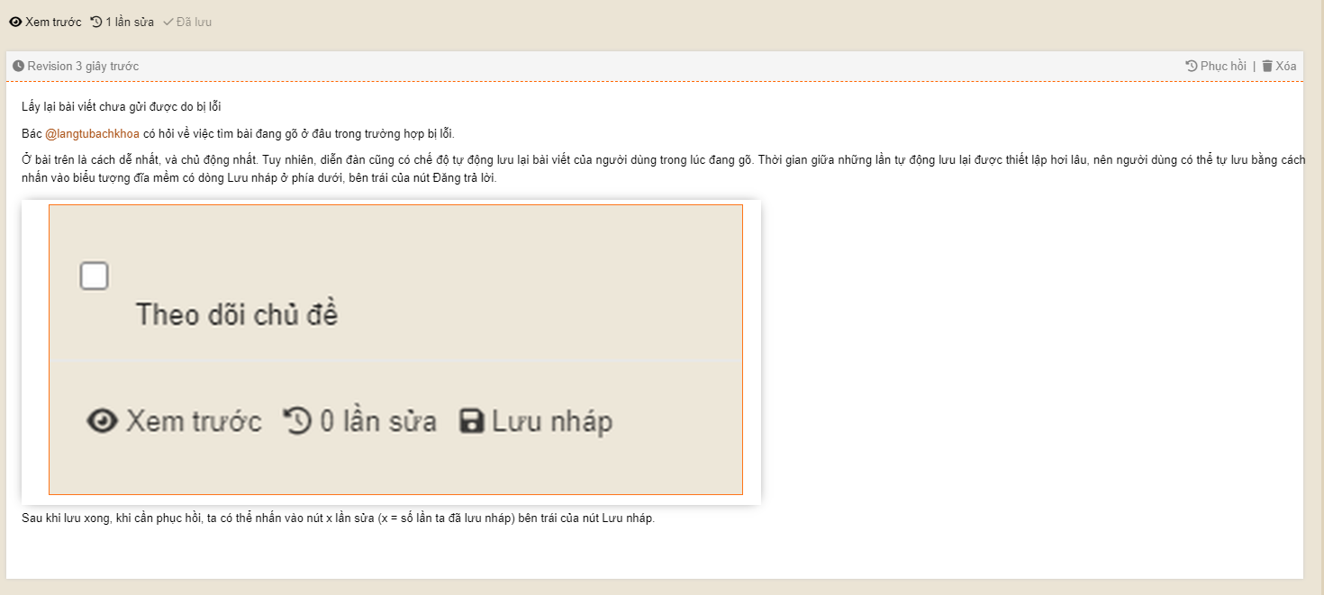 Sau khi lưu xong, khi cần phục hồi, ta có thể nhấn vào nút x lần sửa (x = số lần ta đã lưu nháp) bên trái của nút Lưu nháp.