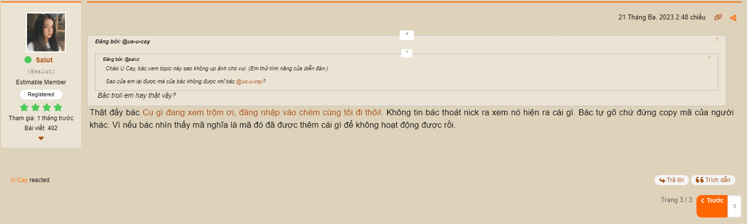 Thật đấy bác Cụ gì đang xem trộm ơi, đăng nhập vào chém cùng tôi đi thôi!. Không tin bác thoát nick ra xem nó hiện ra cái gì. Bác tự gõ chứ đừng copy mã của người khác. Vì nếu bác nhìn thấy mã nghĩa là mã đó đã được thêm cái gì để không hoạt động được rồi.