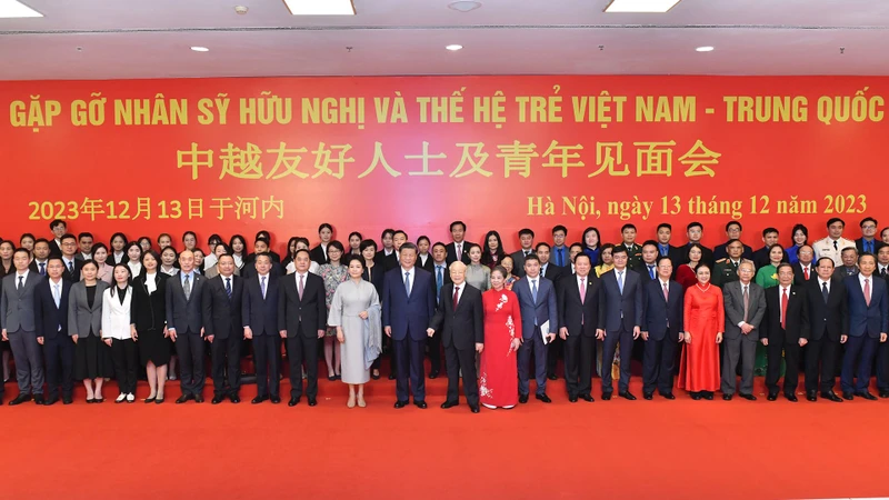 Tổng Bí thư Nguyễn Phú Trọng và Phu nhân, Tổng Bí thư, Chủ tịch Trung Quốc Tập Cận Bình và Phu nhân cùng các đại biểu tham dự Gặp gỡ nhân sĩ hữu nghị và thế hệ trẻ Việt Nam-Trung Quốc năm 2023. (Ảnh: nhandan.vn)