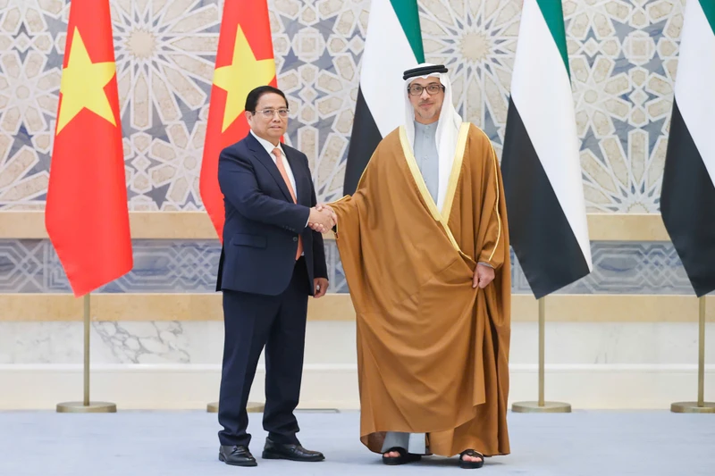 Giữa không gian trang nghiêm trong Cung điện Qasr Al Waltan, Quân nhạc UAE cử Quốc thiều Việt Nam. Sau đó, Thủ tướng Phạm Minh Chính và Phó Tổng thống Sheikh Mansour Bin Zayed Al Nahyan chụp ảnh chung, trước khi quan chức hai nước lên chào nhà lãnh đạo.