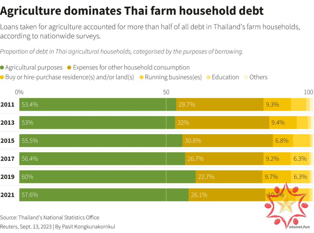 Thái Lan là một trong những nước có mức nợ hộ gia đình cao nhất châu Á . Theo dữ liệu của chính phủ, vào năm 2021. 66,7% tổng số hộ gia đình nông nghiệp mắc nợ. Phần lớn là từ các hoạt động liên quan đến nông nghiệp.