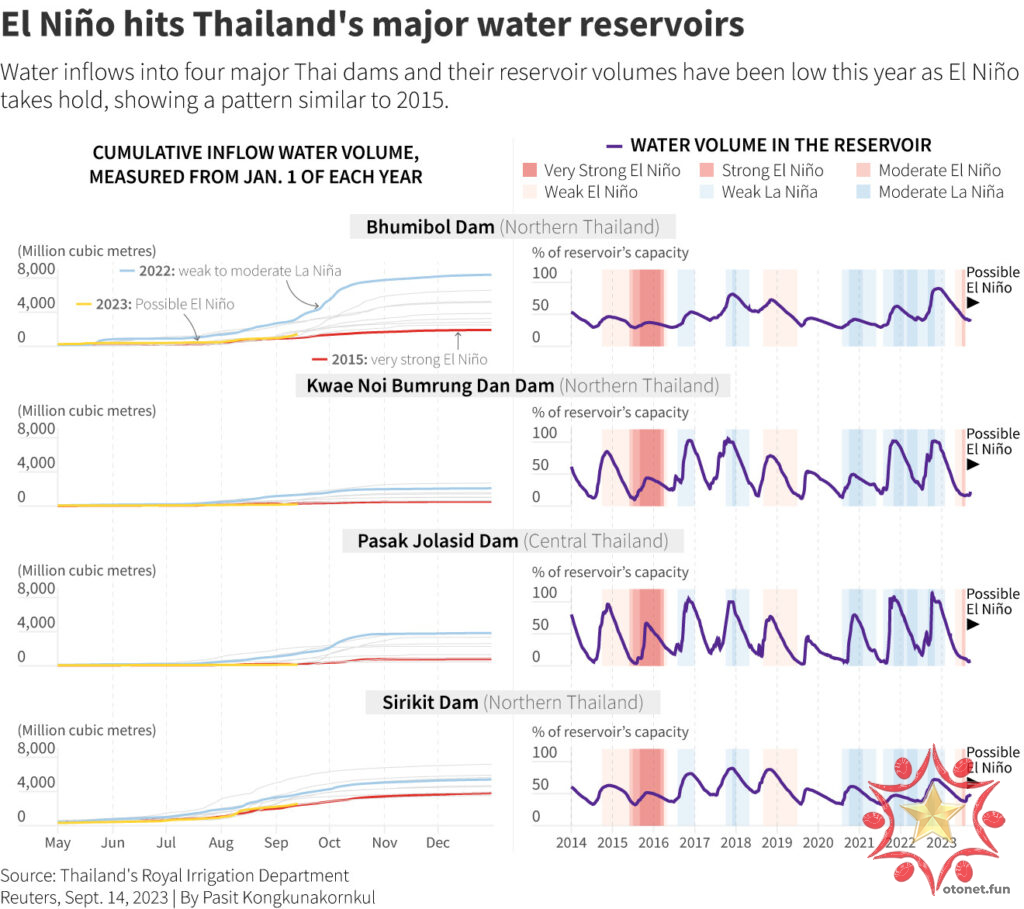 Theo Văn phòng Nước Quốc gia, các kiểu thời tiết cực đoan do hiện tượng El Nino gây ra đang tạo ra rủi ro cho nông dân. Lượng mưa năm nay thấp hơn 18% so với bình thường. Các hồ chứa chính chỉ được lấp đầy khoảng 54% tổng công suất.