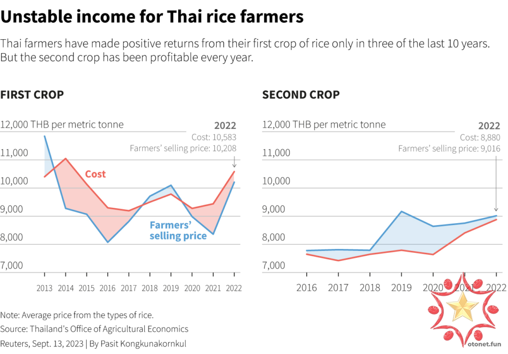 Thu nhập trung bình của nông dân Thái Lan đã giảm sút. Theo dữ liệu của chính phủ, trong thập kỷ qua, người trồng lúa đã kiếm được lợi nhuận ròng dương từ vụ đầu tiên chỉ sau ba năm.