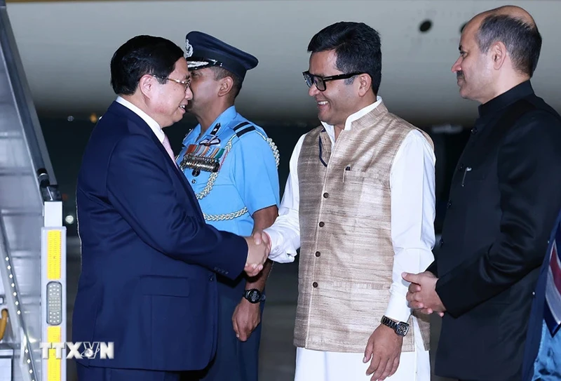 | Các quan chức Ấn Độ đón Thủ tướng Phạm Minh Chính tại sân bay quân sự Palam, Thủ đô New Delhi. (Ảnh: Dương Giang/TTXVN) |