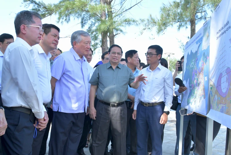| Thủ tướng Phạm Minh Chính đi thị sát khu vực thuộc phạm vi Dự án nghiên cứu lấn biển phục vụ Khu thương mại tự do Đà Nẵng. (Ảnh: THANH GIANG) |